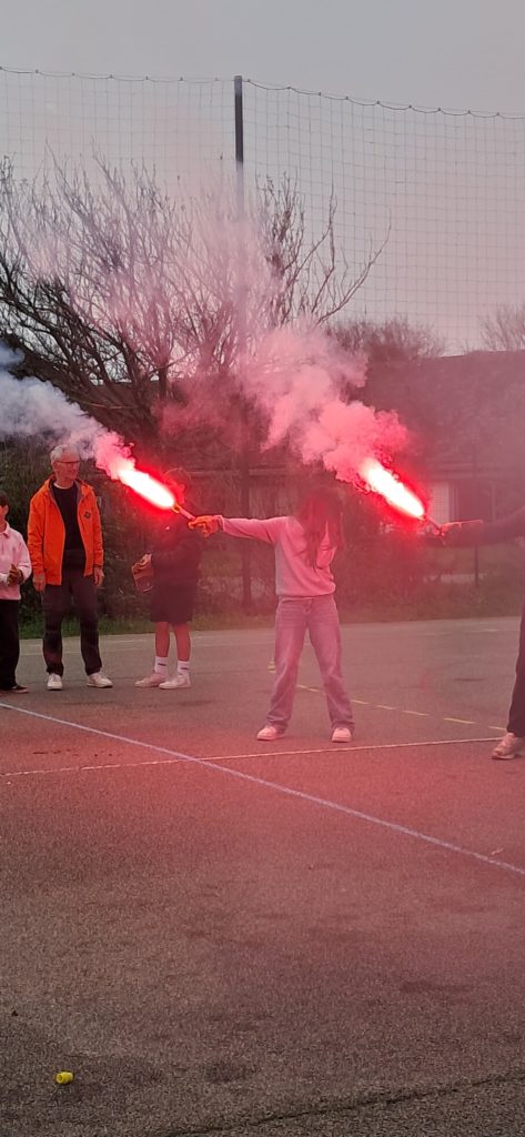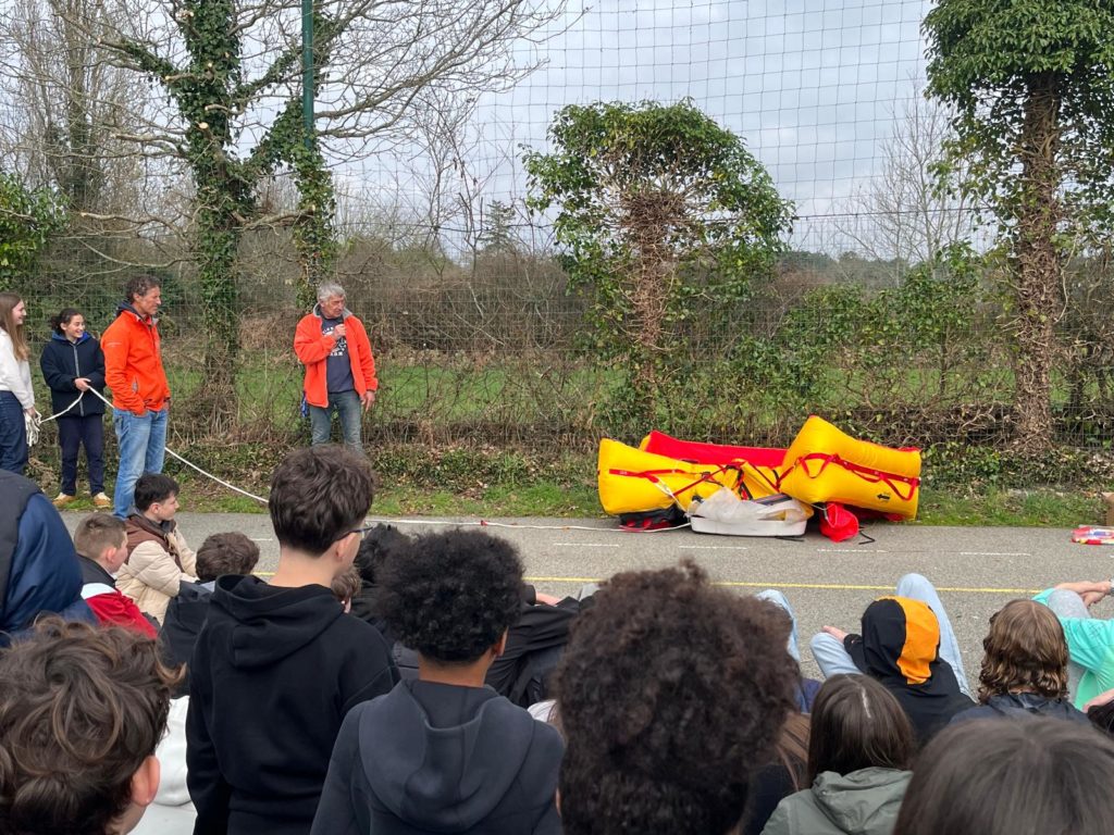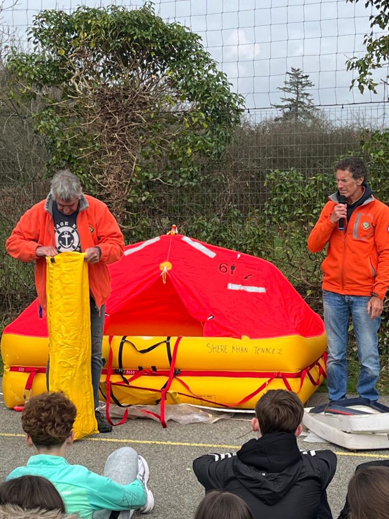 Pour l’occasion, des représentants de la SNSM de Baden sont venus présenter l’association à nos élèves ce lundi 9 mars. Présentation du bénévolat, du secourisme en mer, et démonstration de la percussion d’un canot de sauvetage et de fumigènes de détresse. Les élèves ont adoré !